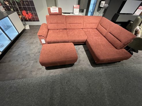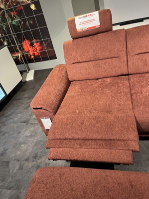 Die Wohnlandschaft Casa Comfort der Firma Dietsch Polstermöbel ist in einem tollen Stoff in mahagoni gehalten. Die Sitztiefe lässt sich durch eine manuelle Sitztiefenverstellung noch verringern und lädt sowohl zum Lümmeln, als auch zum ordentlichen Sitzen ein.