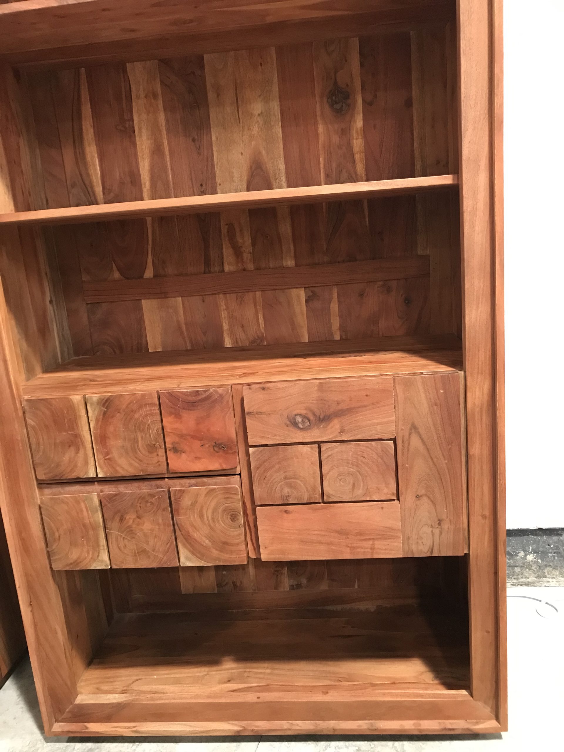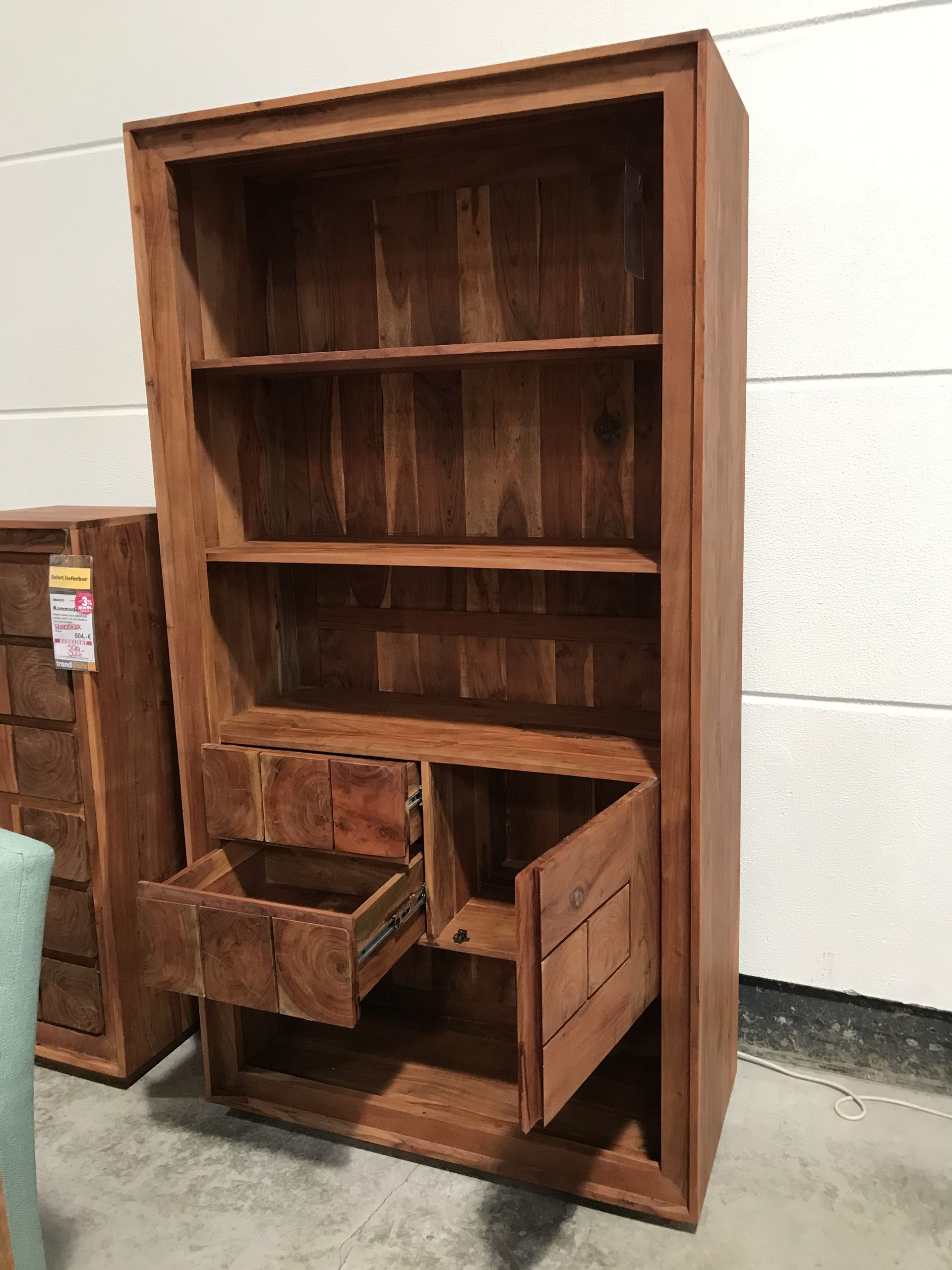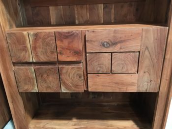 Das Regal Timber der Firma Ludwig Gutmann ist aus massivem Akazienholz gearbeitet. Die Oberfläche wurde gebeizt, sodass die elegante und vielfältige Maserung zur Geltung kommen kann.