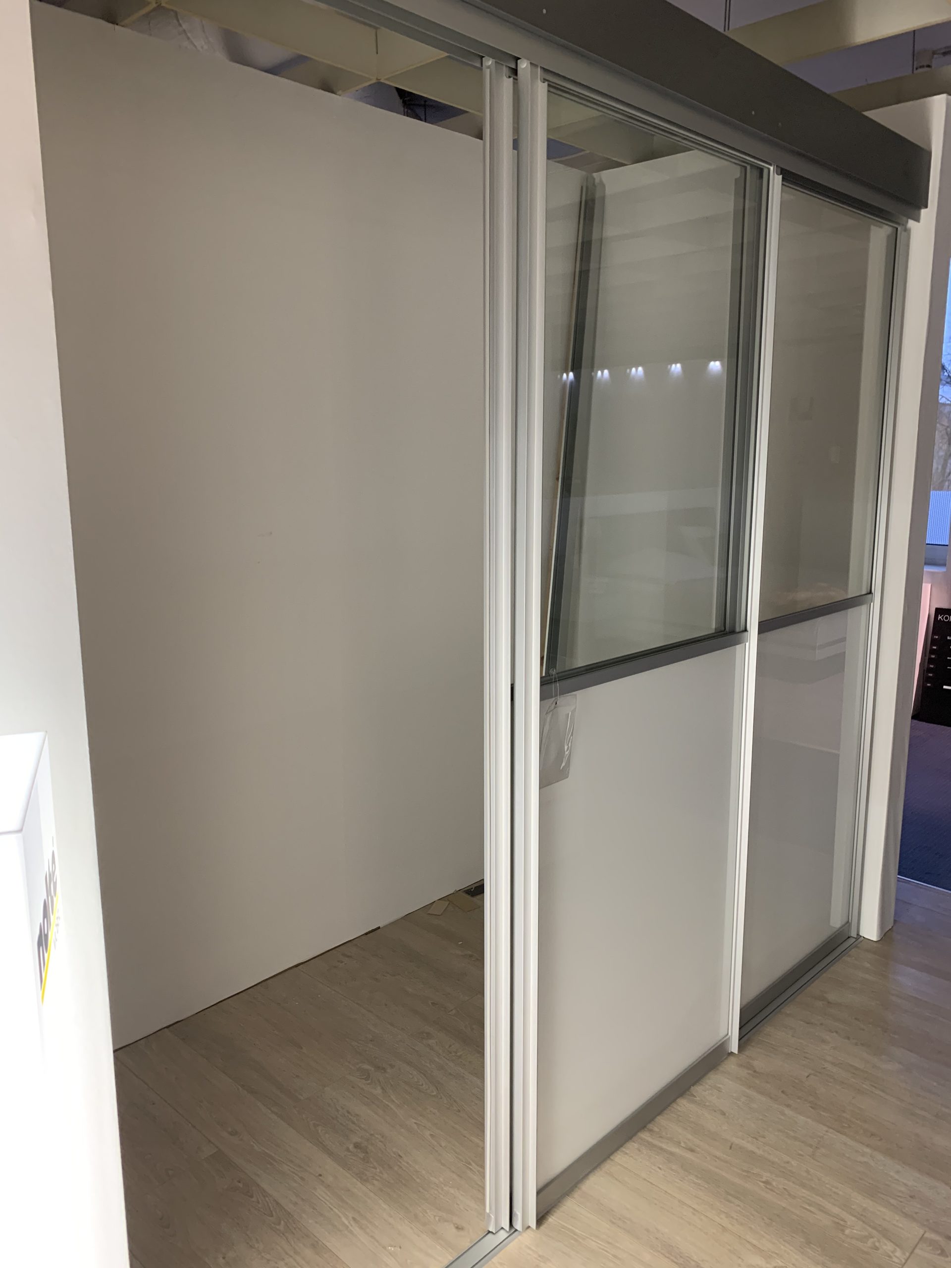 Der Raumteiler-Schiebtür der Firma nolte besteht aus drei Schiebetüren mit Sicherheitsglasfenstern und weissglas Fronten, die sich über ein Schienensystem öffnen lassen. Teilen sie eine Räumlichkeit oder schaffen sie sich einen Erker, dass liegt ganz bei ihnen.
