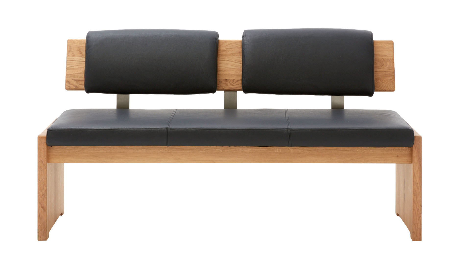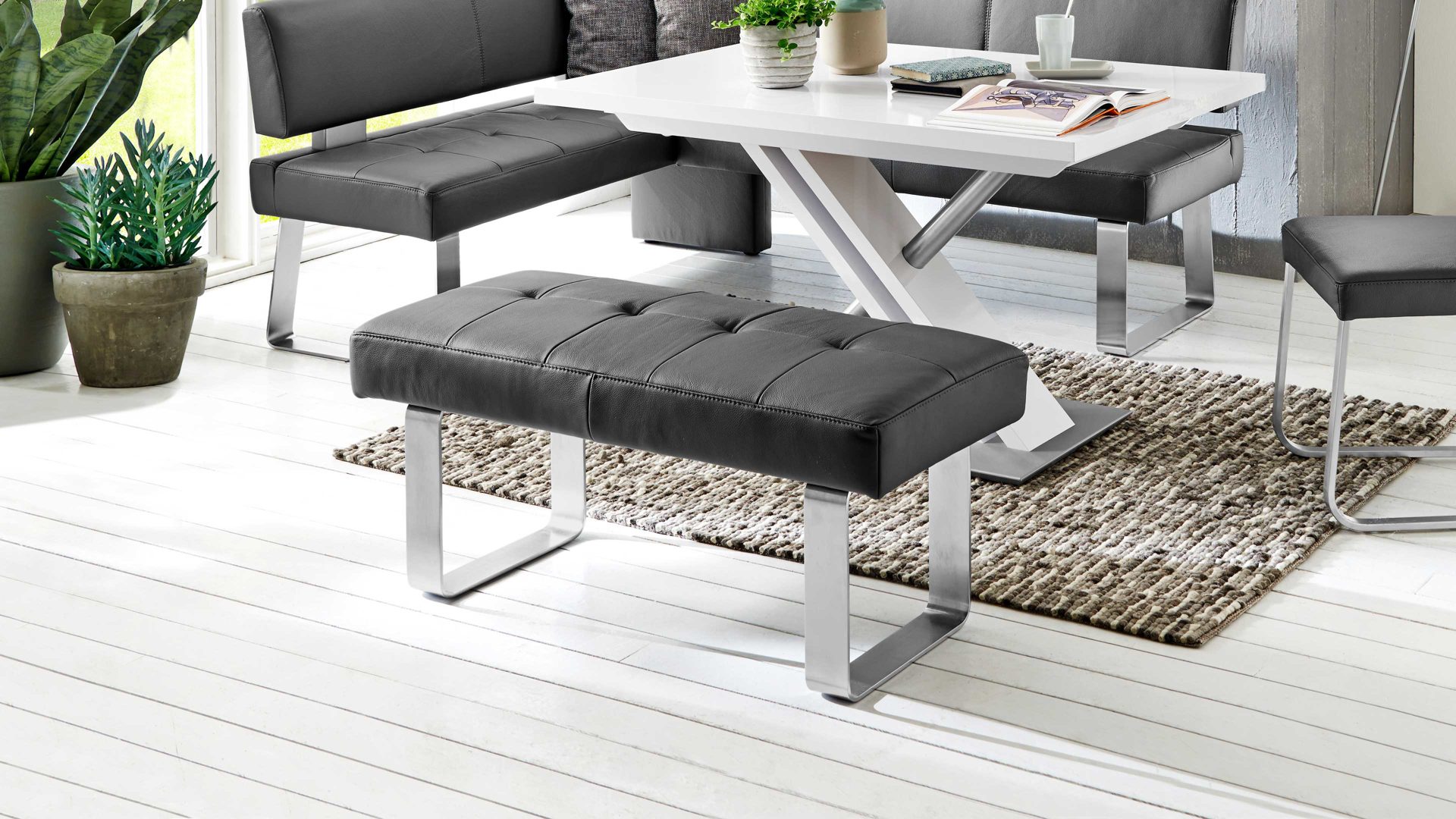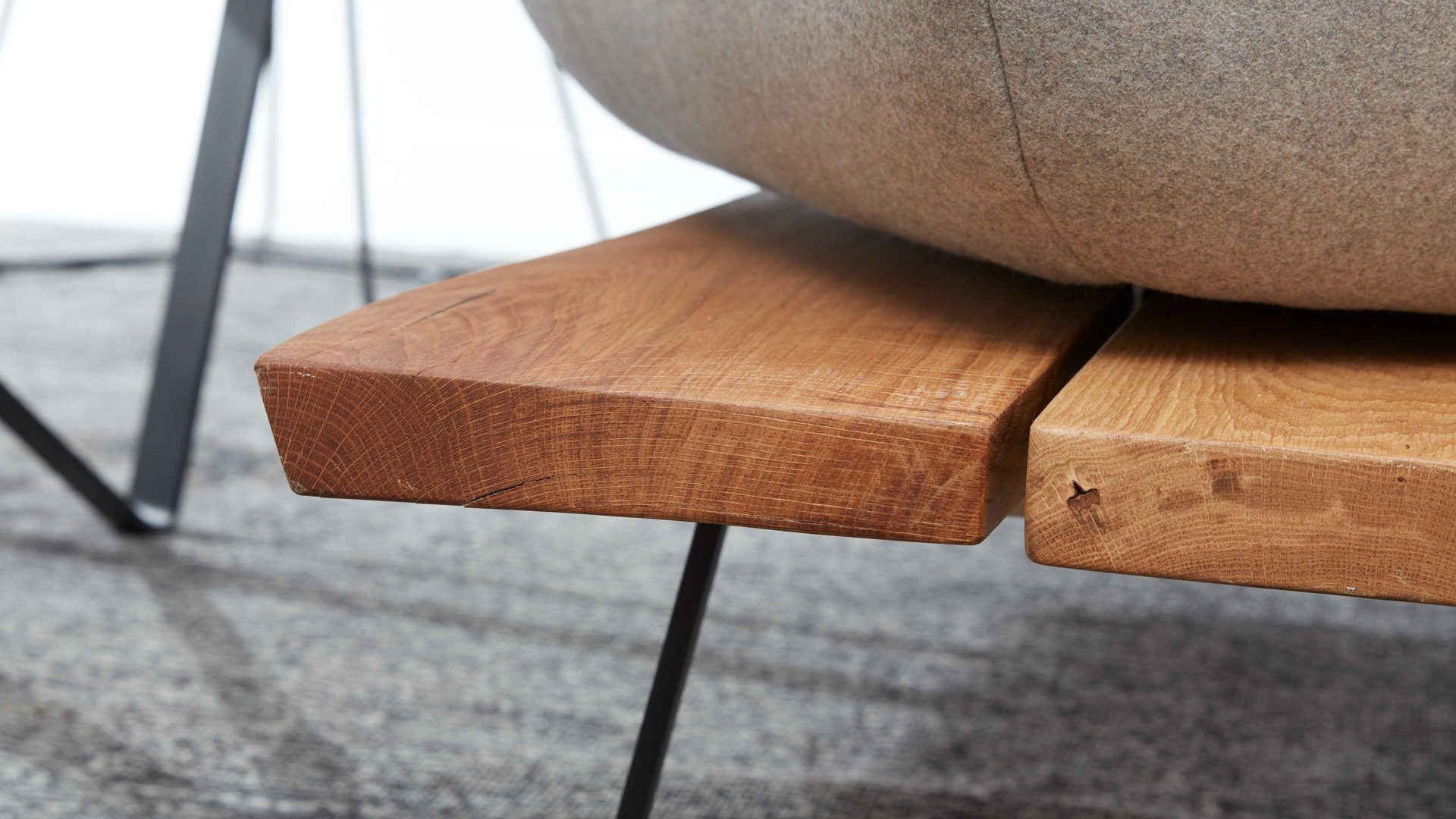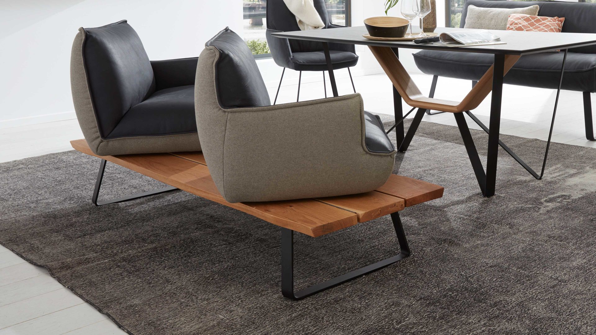 Als Basis fungieren ein mattschwarz pulverbeschichtetes Flachkufengestell mit Struktur sowie ein UV-beschichtetes Wildeichen-Plateau mit Öl-Effekt. Letzteres sorgt für eine natürlich-warme Note. Die beiden Sitzeinheiten der außergewöhnlichen Esszimmerbank sind innen mit dunklem Leder bezogen - außen weisen sie einen Lodenbezug auf.
