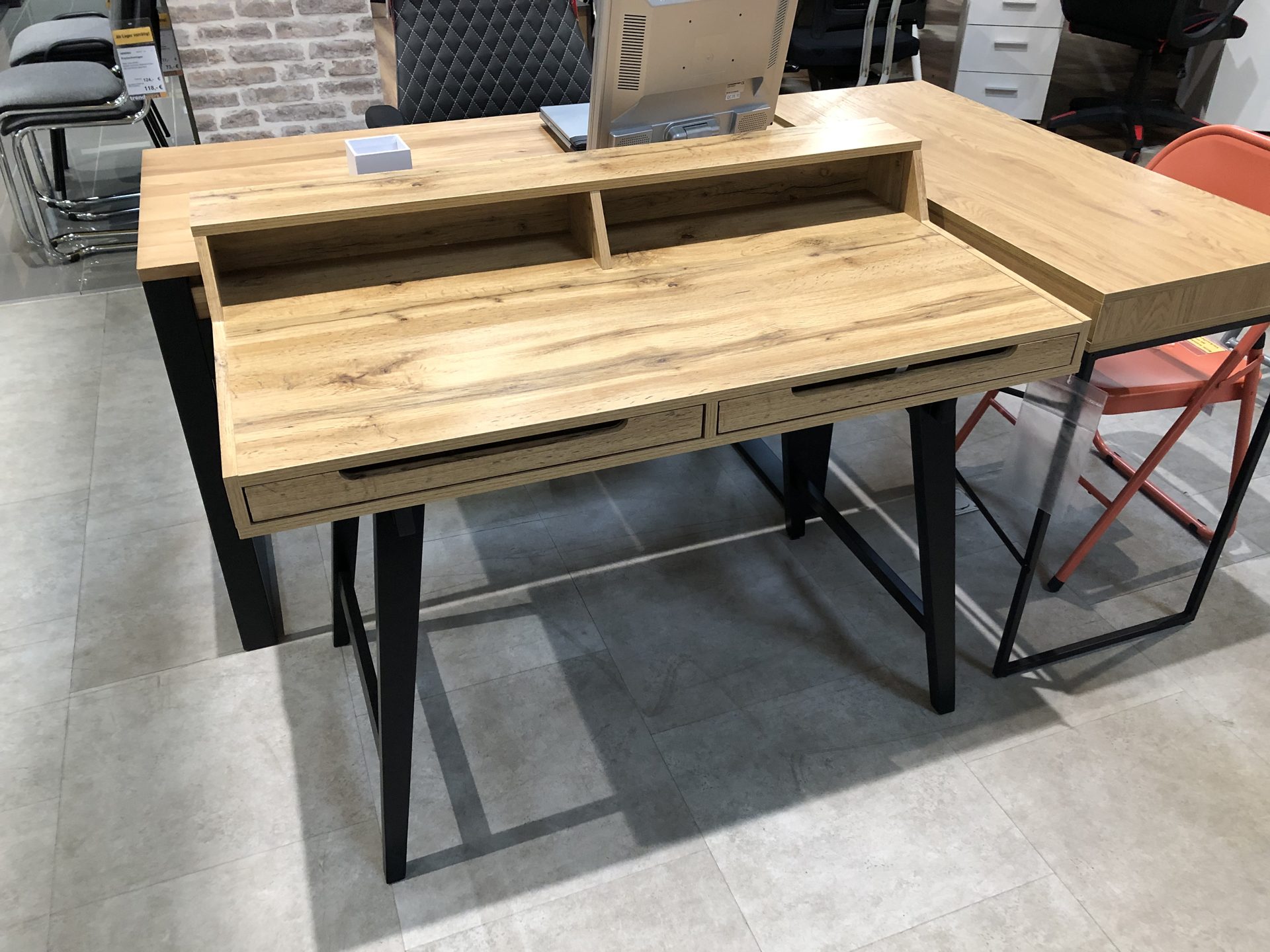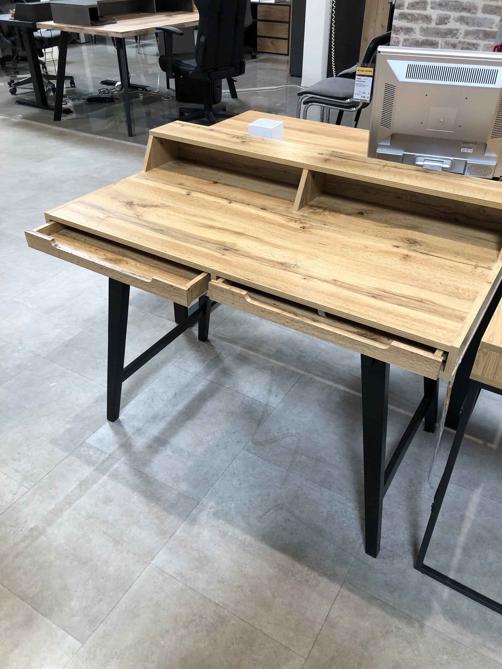 Der Schreibtisch Stockholm der Firma M2 bietet viel Platz zum Arbeiten. Die Tischplatte ist aus MDF Dekor im Farbton Wildeiche. Das Gestell ist ein Massivholzgestell in schwarz.