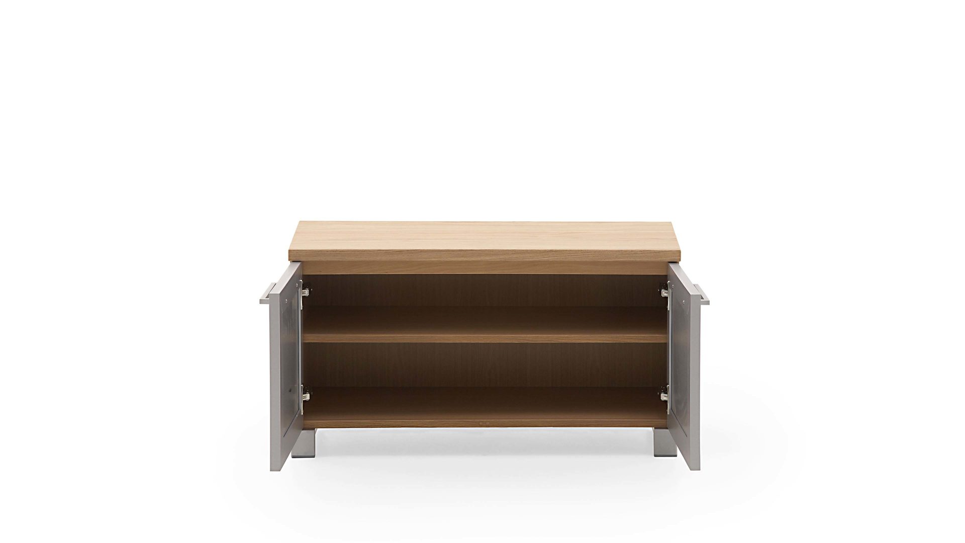 Das Dielenmöbel mit einem Eiche Bianco furnierten Korpus und taupefarbenen Glasfronten ist perfekt für einen modernen Einrichtungsstil geeignet. Hinter den zwei Türen verbergen sich zwei Ablagen, die Platz für Schuhe oder Schal, Mütze und Regenschirm bieten. Der Flurschrank hat Maße von ca. 84 x 45 x 40 cm (BxHxT) und ist Teil eines umfangreichen Typenplans.