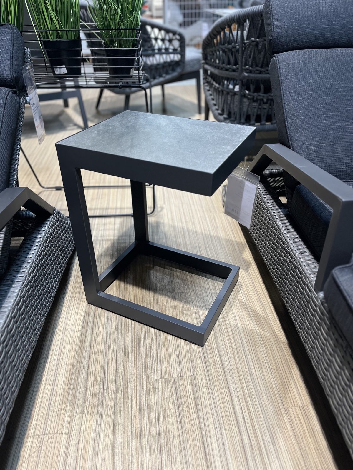 Das Gestell ist aus Aluminium in anthrazit gefertigt. Die Tischplatte ist Keramik in Betonoptik.