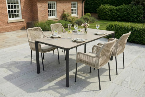 Der Armlehnstuhl Stilo der Firma Wholesaler ist aus einem Ropegeflecht in natur gefertigt.