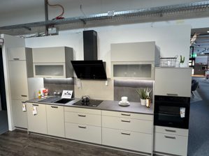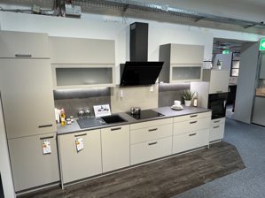 Die Küche Matera von Wertküchen ist im modernen, schlichten kieselgrau gehalten. Die Arbeitsplatte ist in basalt graphit. Die Griffe sind Bügelgriffe edelstahlfarbig