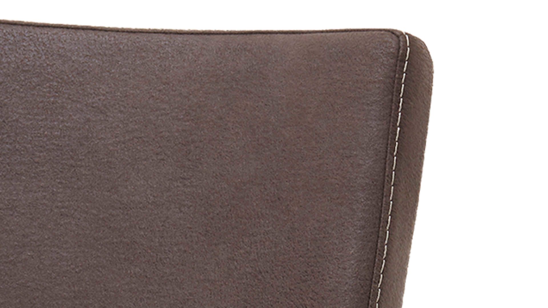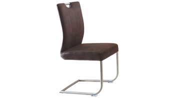 Der Schwingstuhl Larissa besteht aus einem robusten, stabilisierenden Kantrohr-Edelstahlgestell als Basis und einer Sitzfläche, die mit dunkelbraunem Stoff bezogen ist. Durch die Materialien und die Farbgebung strahlt der Freischwinger moderne Eleganz aus. Die beigefarbene Kontrastnaht setzt einen stilvollen Akzent.