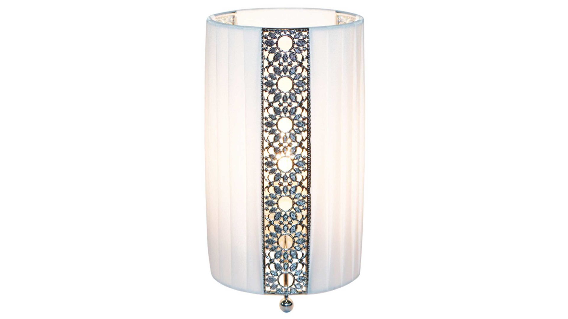 Sie überzeugt mit ihrem gefalteten weißen Stoff-Lampenschirm, dessen edle florale Applikationen im attraktiven Farbton Silber ganz klar die optischen Highlights bilden.