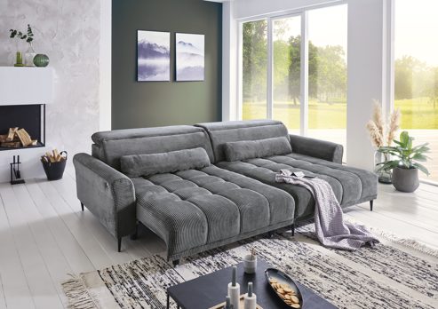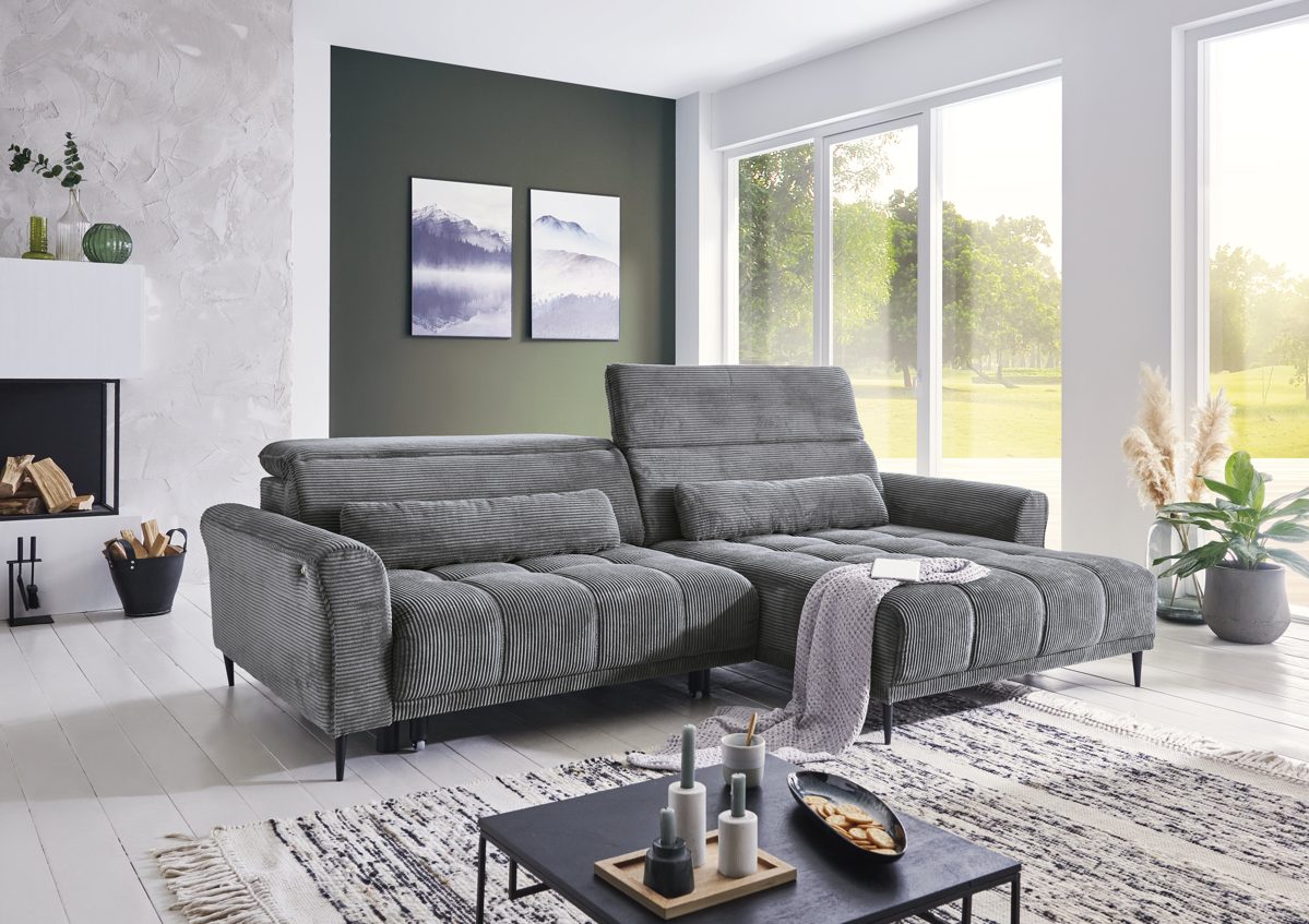 Das Ecksofa Logan der Firma Iwaniccy ist im angesagten Cord-Stoff in der Farbe dunkelgrau gehalten.. Das Highlight ist die XL elektrisch verstellbare Sitzfläche, die zu einer bequemen Position wird, um die Beine hochzulegen.