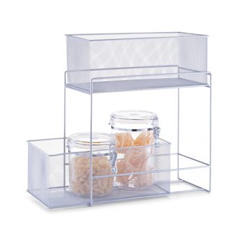 Dank diesem praktischen Etagenregal aus Stahlgeflecht mit zwei Körben aus Mesh gewinnen Sie wertvollen Stauraum in Ihrem Zuhause. Es schafft Ordnung in Ihren Schränken und Regalen und eignet sich ideal für den Einsatz in den Küchen-, Vorrats- oder Badschränken.