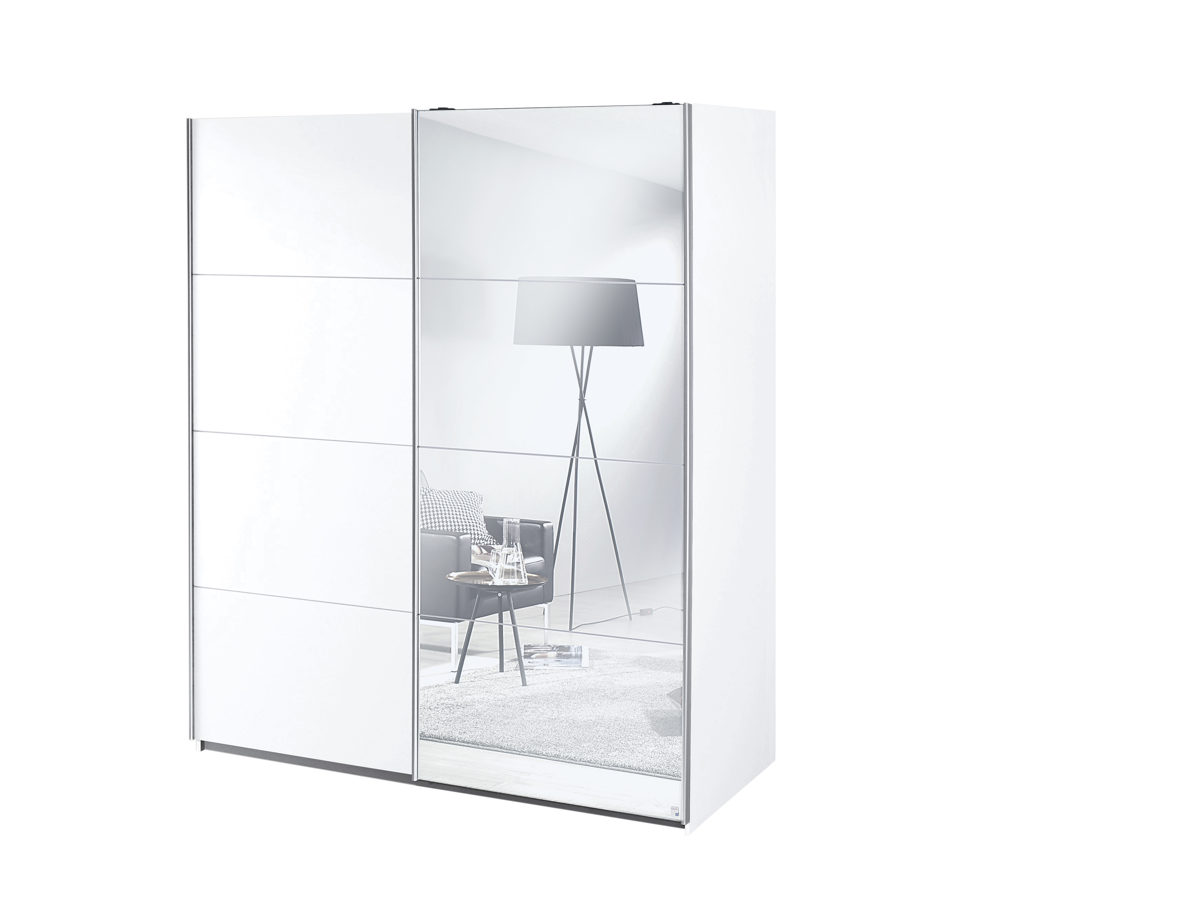 Der Kleiderschrank Subito der Firma Rauch Möbel verfügt über 2 Schwebetüren, von denen eine eine Spiegeltüre ist, welche den Raum optisch vergrößert.