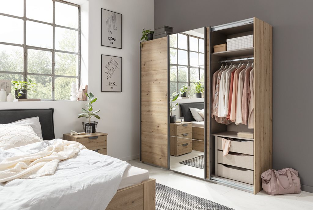 Der Kleiderschrank Kulmbach der Firma Rauch Möbel verfügt über 3 Schwebetüren, von denen eine eine Spiegeltüre ist, welche den Raum optisch vergrößert.