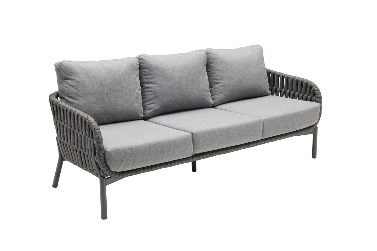 Das Dining 3er Sofa Terrano der Firma Wholesaler ist aus einem Ropegeflecht in dunkelgrau und einem Gestell aus Aluminum gehalten.
