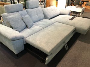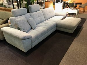 Die Wohnlandschaft Viva der Firma Carina ist in einem freundlichen blau/grün gehalten. Sie besitzt eine Bettfunktion, zwei Kopfstützen und ein elektisches Canape mit Relaxfunktion.