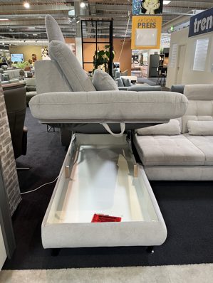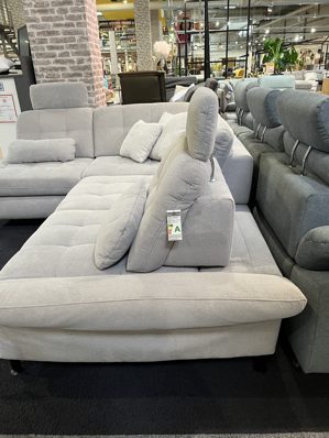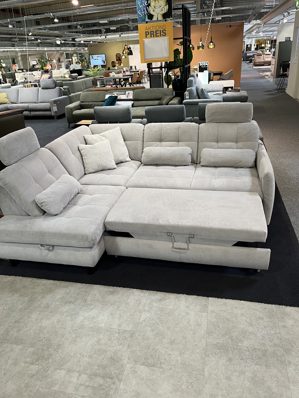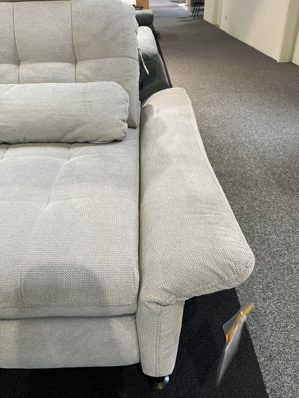 Die Wohnlandschaft MM-MP 1143 der Firma Megapol ist in Stoff Belle silver gehalten. Sie verfügt über eine Sitztiefenverstellung an jedem Sitzplatz des 2,5-Sitzers. Zudem befindet sich im 2,5-Sitzer eine Schlaffunktion.
