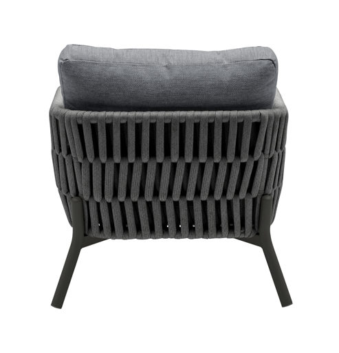 Der Diningsessel Terrano der Firma Wholesaler ist aus einem Ropegeflecht in dunkelgrau und einem Gestell aus Aluminum gehalten.