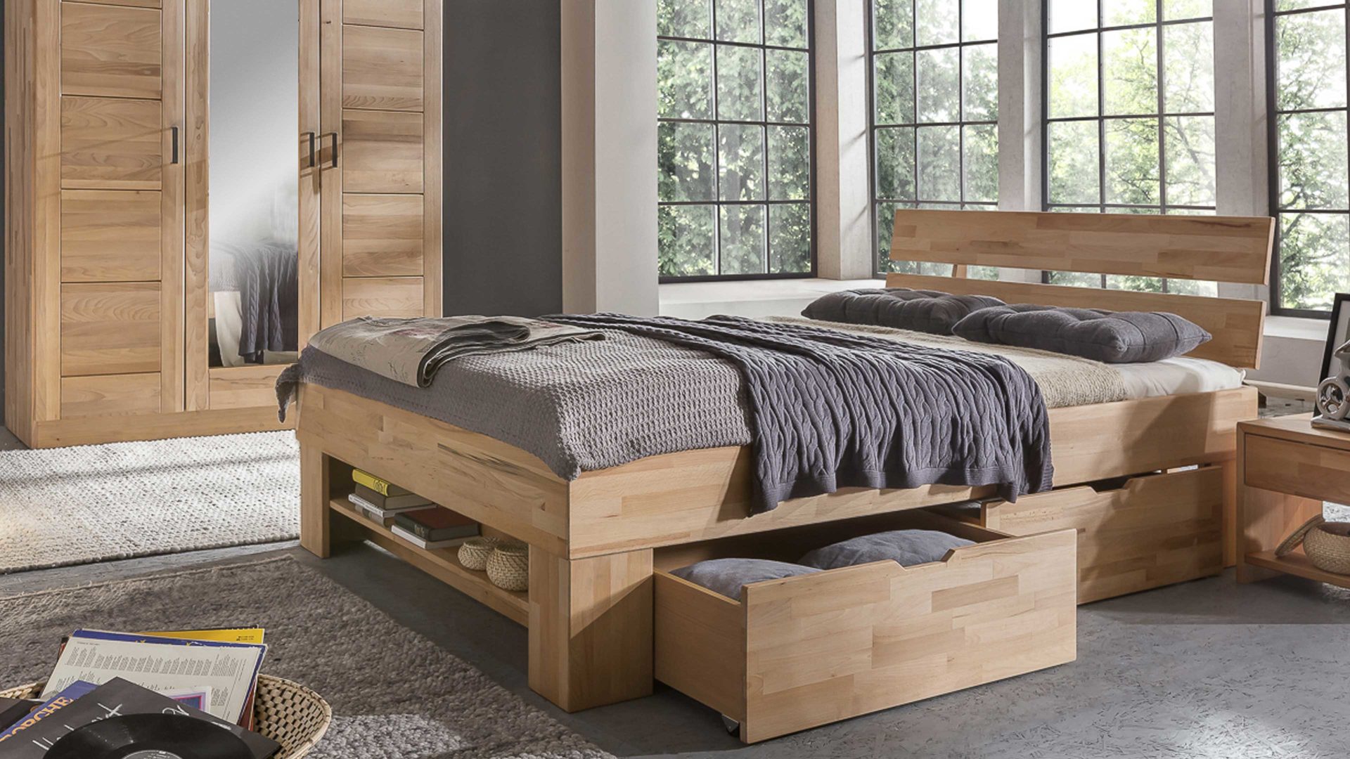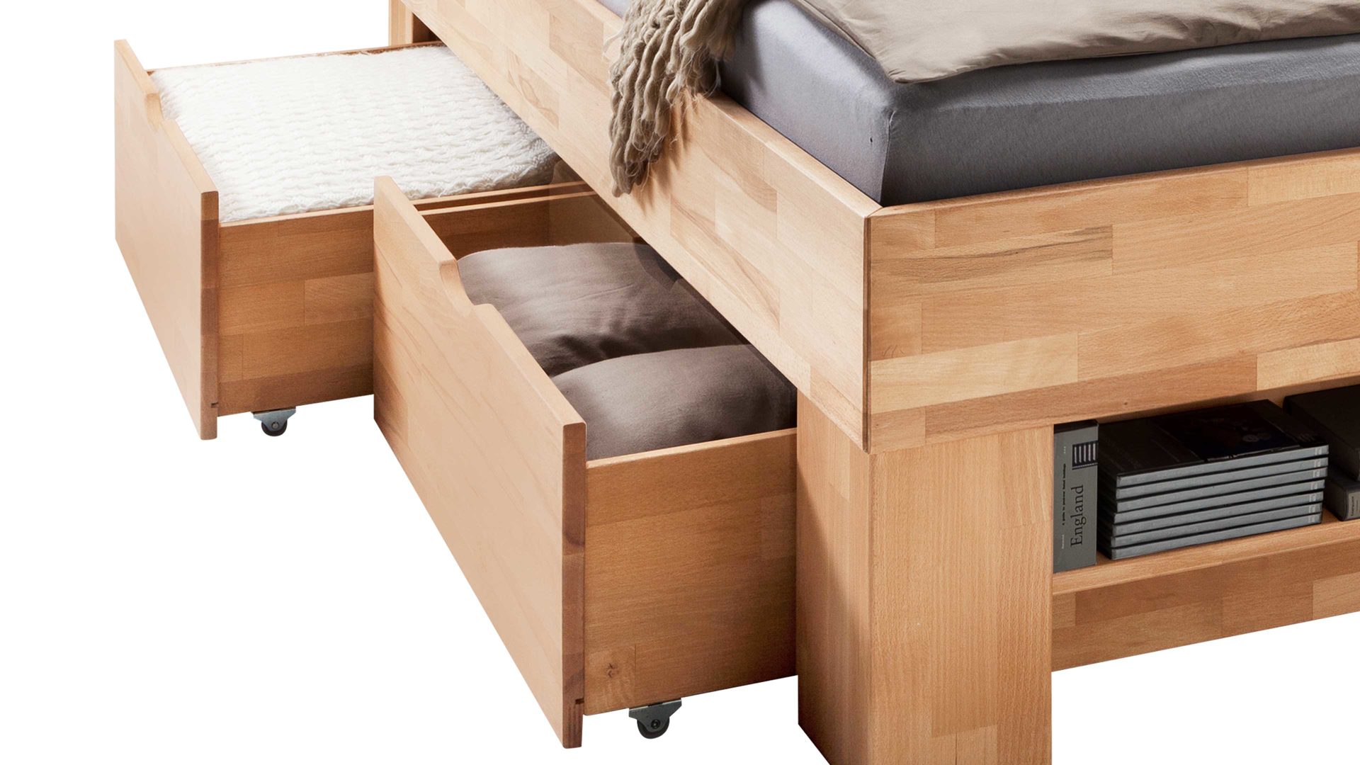 Das Fußteilregal bietet genau wie die inkludierten vier Bettkästen auf Rollen allerhand Stauraum. Zaubern Sie mit diesem Liegemöbel eine Wohlfühl-Atmosphäre in Ihr Schlafzimmer. Das Bettgestell besteht aus geölter massiver Kernbuche. Die Maße der Liegefläche betragen ca. 140 x 200 cm (BxL). Auch als Doppelbettgestell lieferbar,