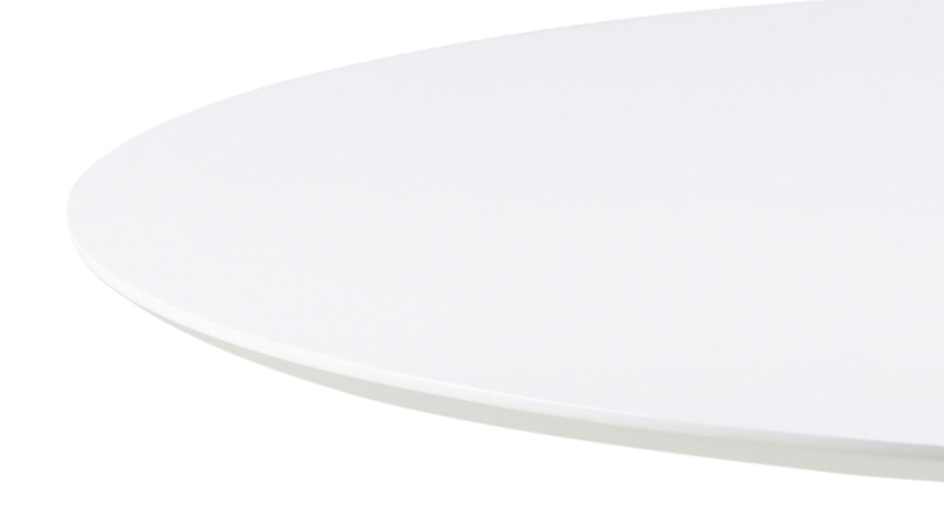 Dieser Esstisch zieht in Ihrer modernen Küche alle Blicke auf sich. Der runde Tisch mit auffälligem Fuß begeistert in strahlendem Weiß und fügt sich damit hervorragend in Ihre Einrichtung ein. Stellen Sie den Esszimmertisch im Retrolook in Ihren Essbereich und freuen Sie sich über die hohe Funktionalität des Esszimmermöbels. Gefertigt aus einer weiß lackierten MDF-Platte und einem Trompetenfuß aus weiß lackiertem Metall begeistert das Esszimmermöbel an geselligen Abenden mit Freunden oder der Familie.