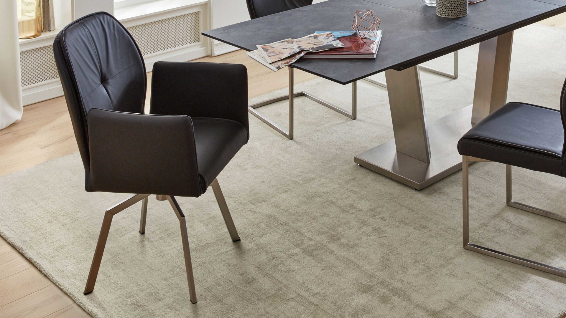 Wähle zwischen schwarz pulverbeschichtetem Metall oder gebürstetem Edelstahl – jeweils mit oder ohne Dreh- und Rückstellmechanismus. Entscheide dich für eine Sitzschale mit oder ohne Armlehne und eine von drei attraktiven Steppungen, um deinen persönlichen Stil perfekt zu unterstreichen. Die Serie bietet dir vier hochwertige Lederfarben und acht moderne Mikrofaserfarben – perfekt auf die stilistischen Möglichkeiten zeitgemäßer Esszimmer abgestimmt.