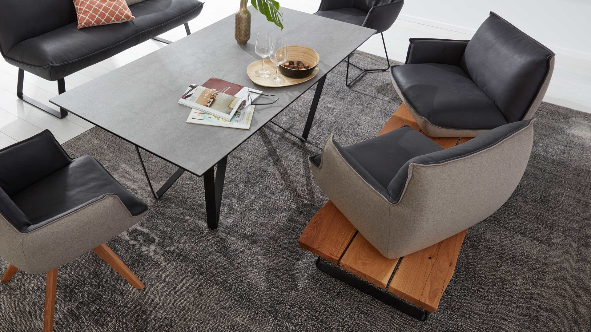 Als Basis fungieren ein mattschwarz pulverbeschichtetes Flachkufengestell mit Struktur sowie ein UV-beschichtetes Wildeichen-Plateau mit Öl-Effekt. Letzteres sorgt für eine natürlich-warme Note. Die beiden Sitzeinheiten der außergewöhnlichen Esszimmerbank sind innen mit dunklem Leder bezogen - außen weisen sie einen Lodenbezug auf.