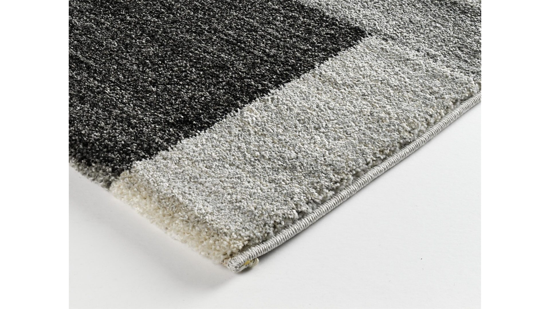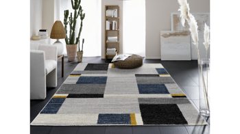 Moderne Mosaikstruktur in angenehm-dezenten Farbverläufen: Die geometrisch angeordneten Vierecke verschiedener Größe und Kolorierung dieses Wohnaccessoires sorgen für Form- und Farbenvielfalt, gleichmäßige Struktur und erzeugen ein harmonisches Karreefeld des Designerteppichs Castle Beppo. Der Webteppich ist seitlich gekettelt und vor Kopf umgeschlagen.