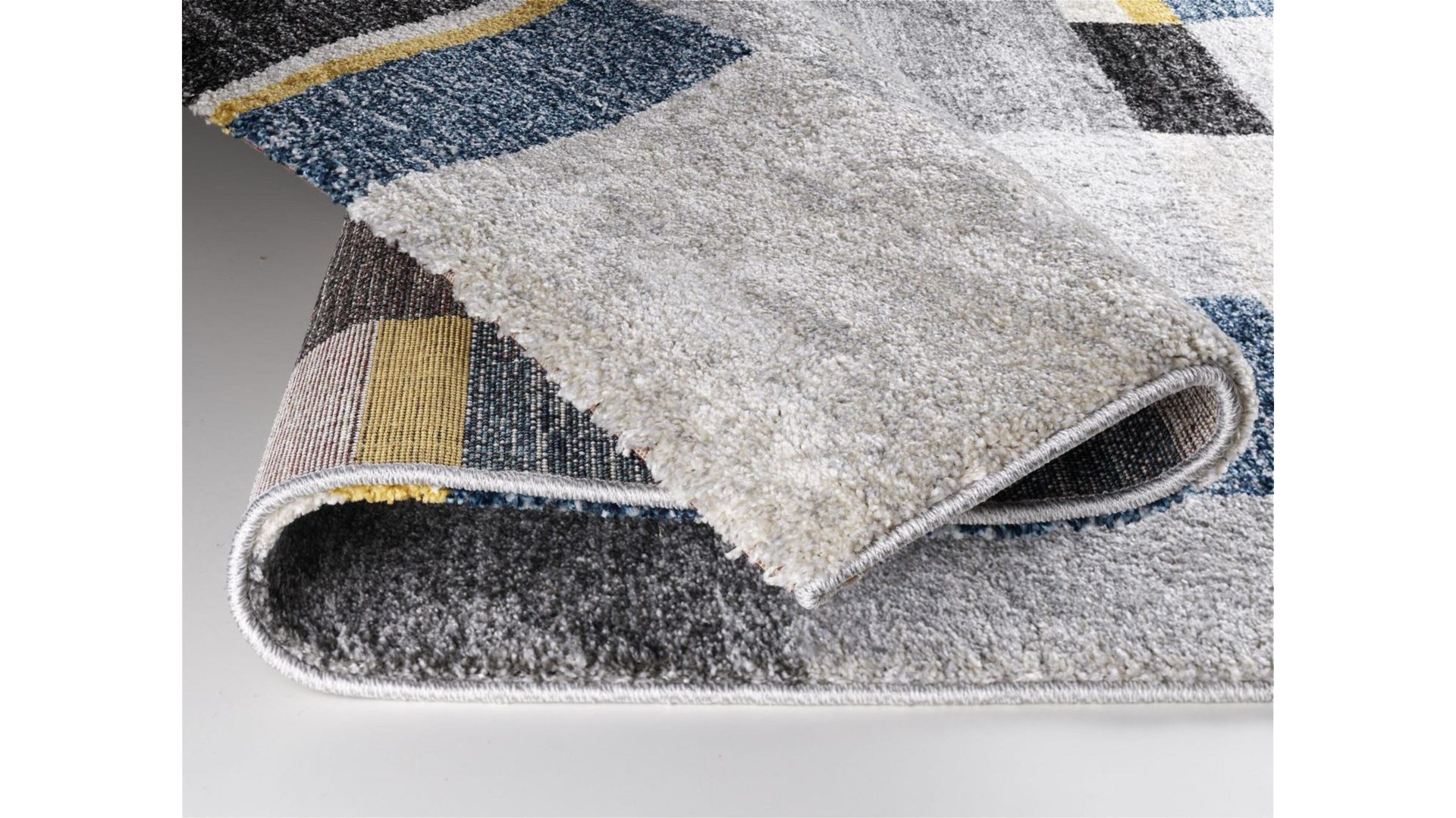 Moderne Mosaikstruktur in angenehm-dezenten Farbverläufen. Dieses Modell gehört zu den Wohnaccessoires mit geometrisch angeordneten Vierecken in verschiedenen Größen und Kolorierungen. Sie sorgen für Form- und Farbenvielfalt, gleichmäßige Struktur und erzeugen ein harmonisches Karreefeld des Designerteppichs Castle Beppo. Der Webteppich ist seitlich gekettelt und vor Kopf umgeschlagen.