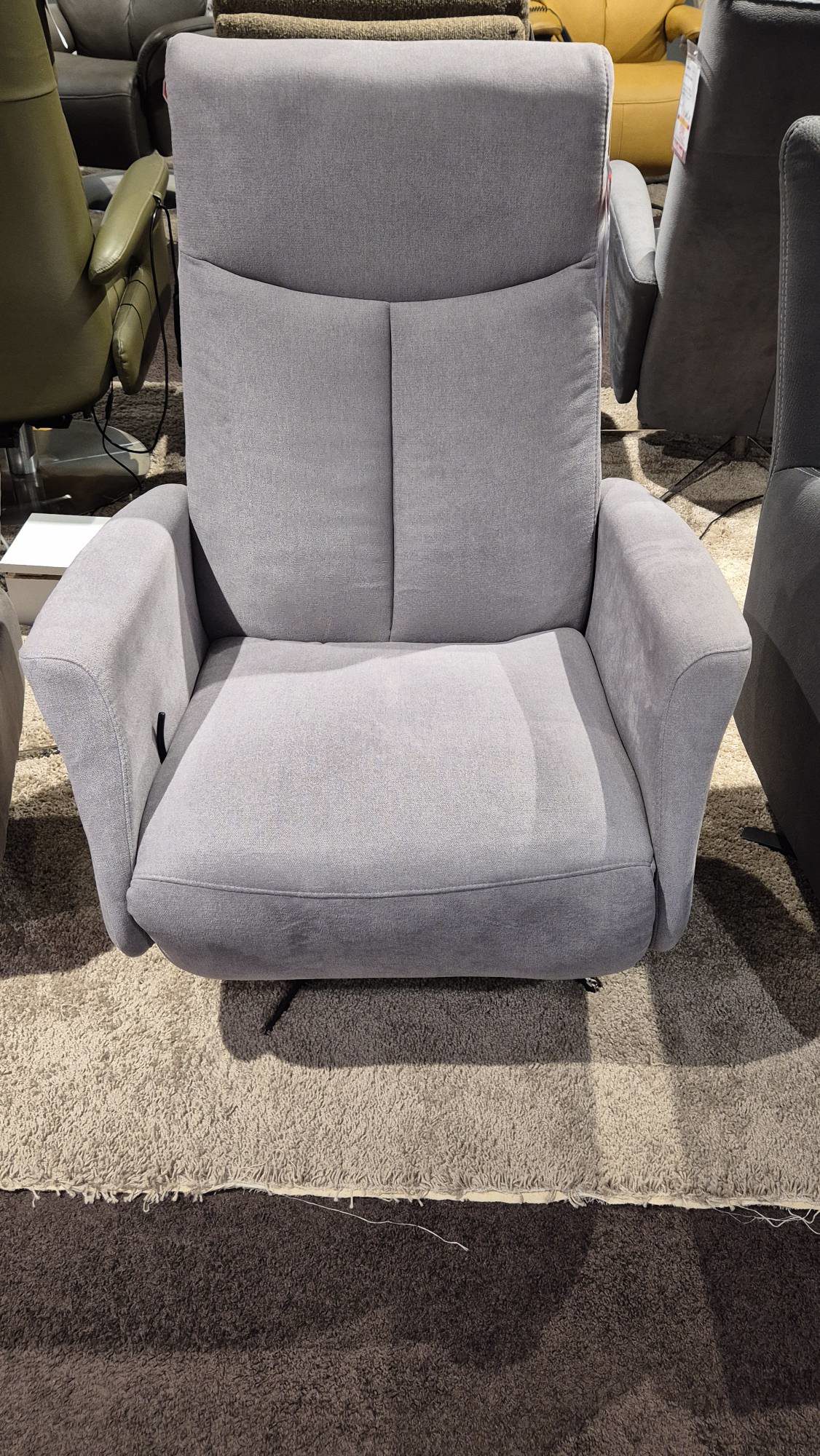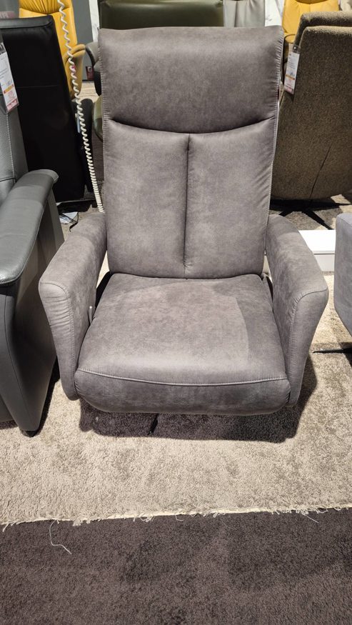 Der Relaxsessel 8026 der Firma Knudsen ist in hell graun Stoff bezogen. Er lässt sich ganz einfach durch eine manuelle Verstellung in eine bequeme Liegeposition bewegen.