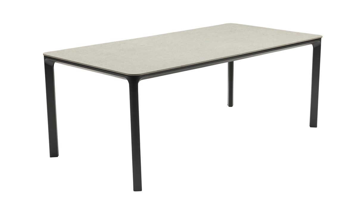 Die Platte ist eine Sintered Stone Platte in der Farbe steingrau. Das Gestell ist ein Aluminiumgestell.