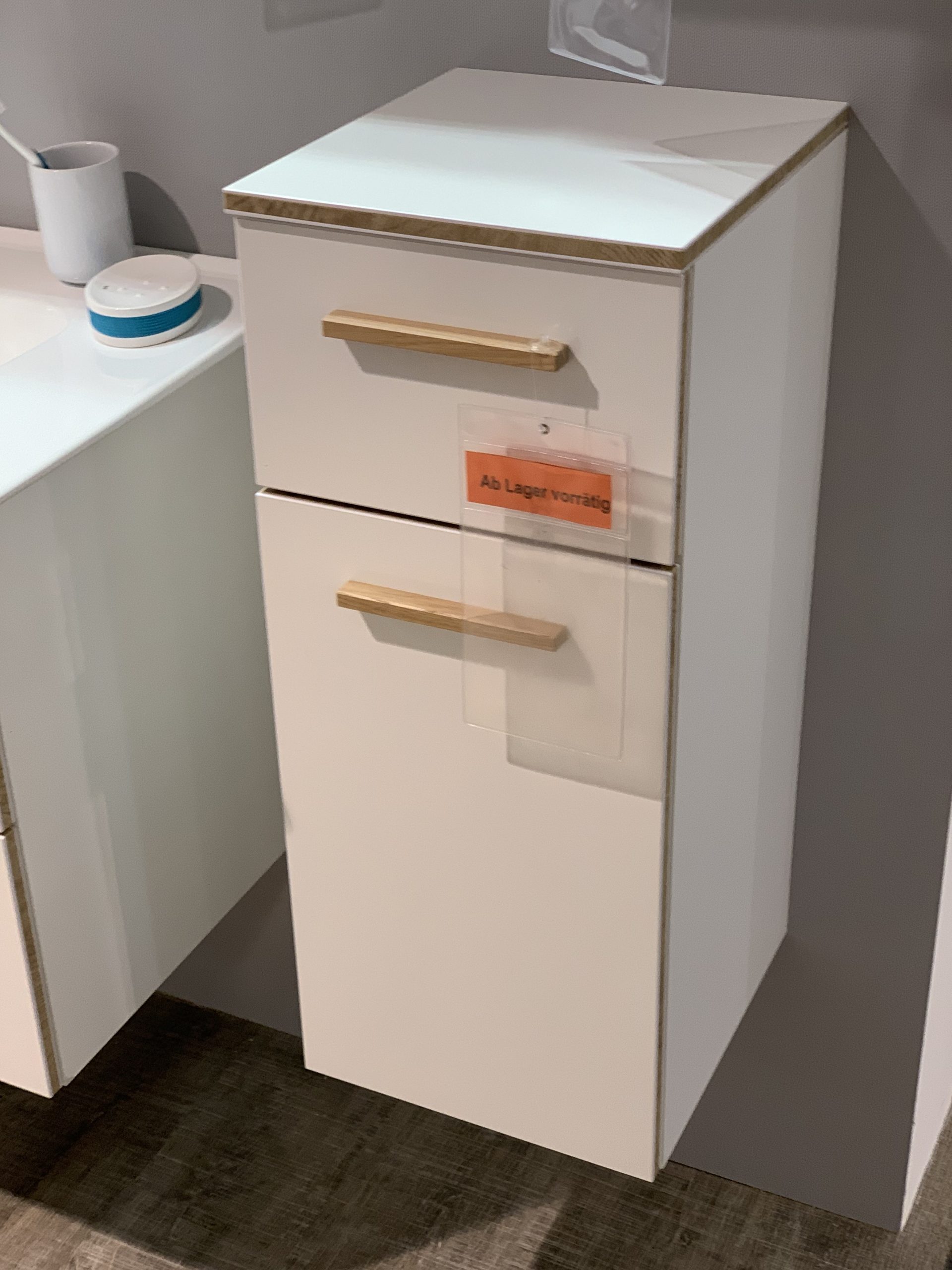 Der Unterschrank Burgas der Firma Pelipal ist in klassichem weiß glanz gehalten, verfügt dennoch über einen Akzent durch Eiche Griffe und Kanten.