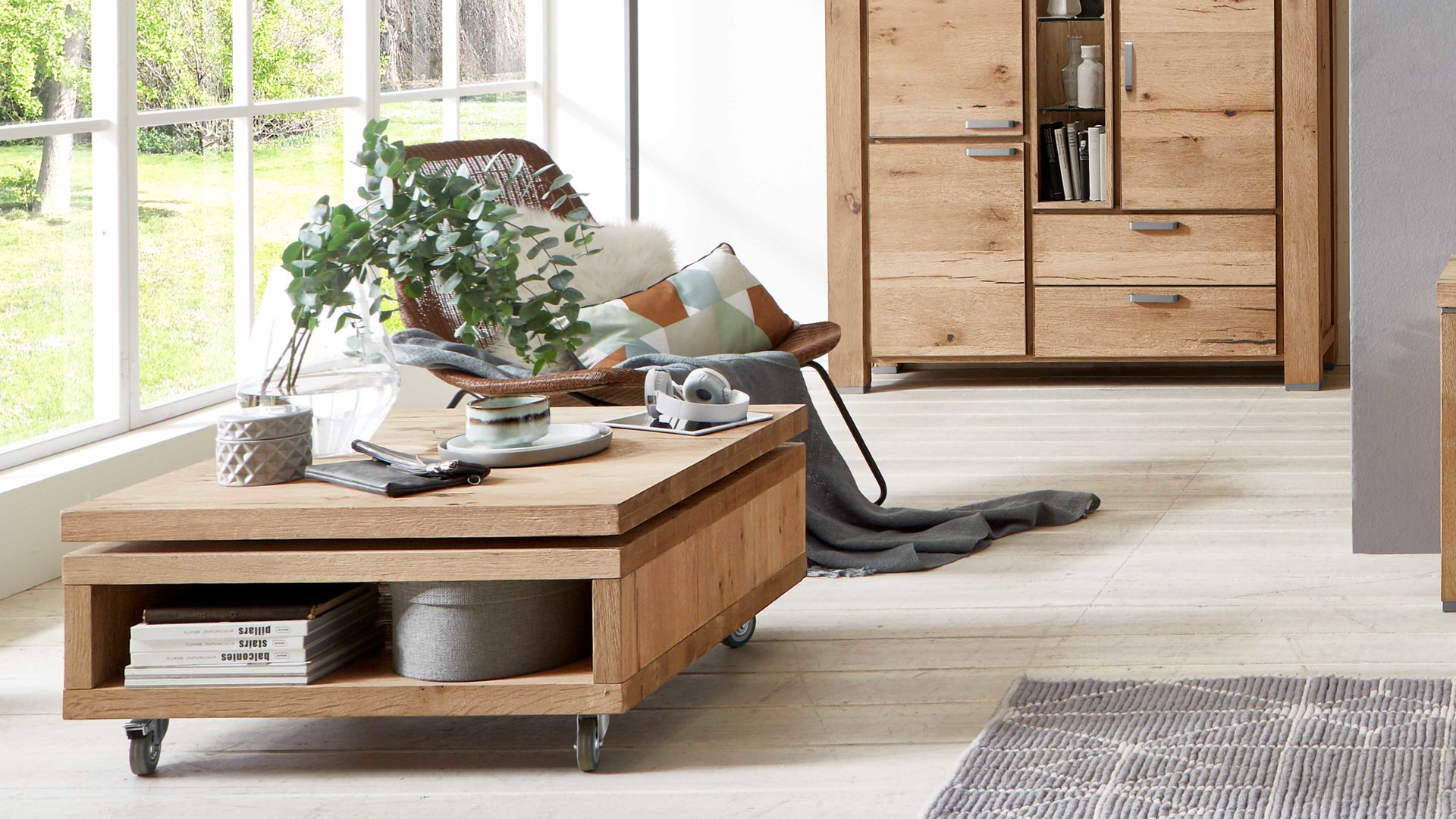 Klein, aber fein! Der WOODS & TRENDS Couchtisch Canova fügt sich harmonisch in Ihr Wohnzimmer ein und verleiht diesem eine behagliche Wohlfühlatmosphäre. Er wurde aus railwaybraunem Eichefurnier gefertigt und weist zudem Metallapplikationen auf. Doch das war noch nicht alles. Dieser kompakte Funktionstisch begeistert mit weiteren Besonderheiten. Er verfügt nicht nur über eine drehbare Tischplatte, sondern auch über ein offenes Fach, das viel Stauraum für Zeitschriften, Bücher oder die Fernbedienung bereithält.