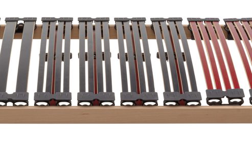 Vier bewegliche Schultermechaniken ermöglichen ein sanftes Einsinken in Seitenlage, während vier Drittleistenpaare mit Dynamik-Reglern eine stufenlose Härteeinstellung im Mittel- und Lordosebereich bieten. Dadurch lässt sich das Federverhalten perfekt auf das eigene Körpergewicht und die bevorzugte Schlafposition abstimmen. Die Federleisten sind in überstehenden, langlebigen Hightech-Kappen gelagert, die dauerhaft elastisch bleiben und ein geräuscharmes Liegegefühl garantieren.