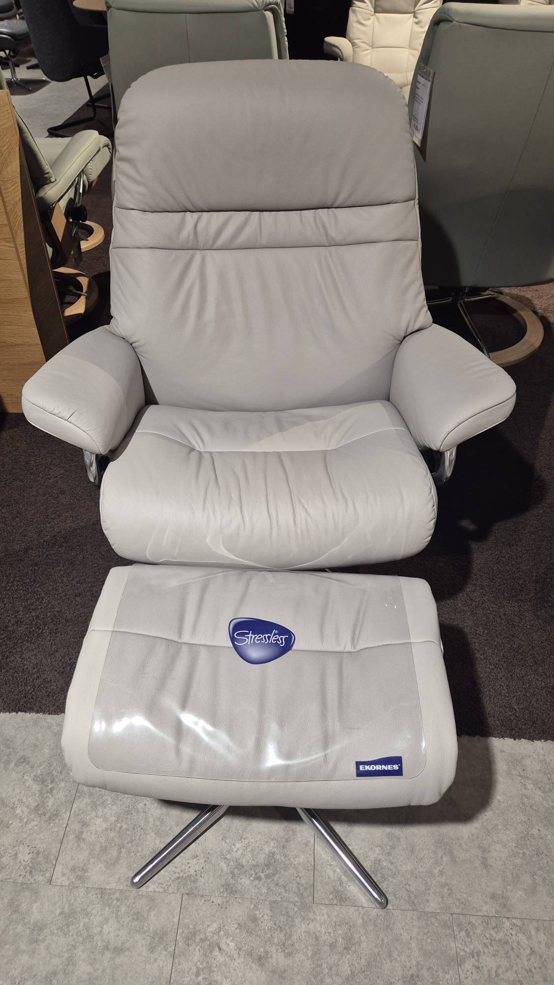 Der Relaxsessel Sunrise der Firma Stressless ist in hell graum Leder bezogen. Er lässt sich ganz einfach in eine bequeme Liegeposition verstellen.