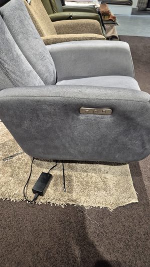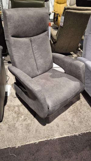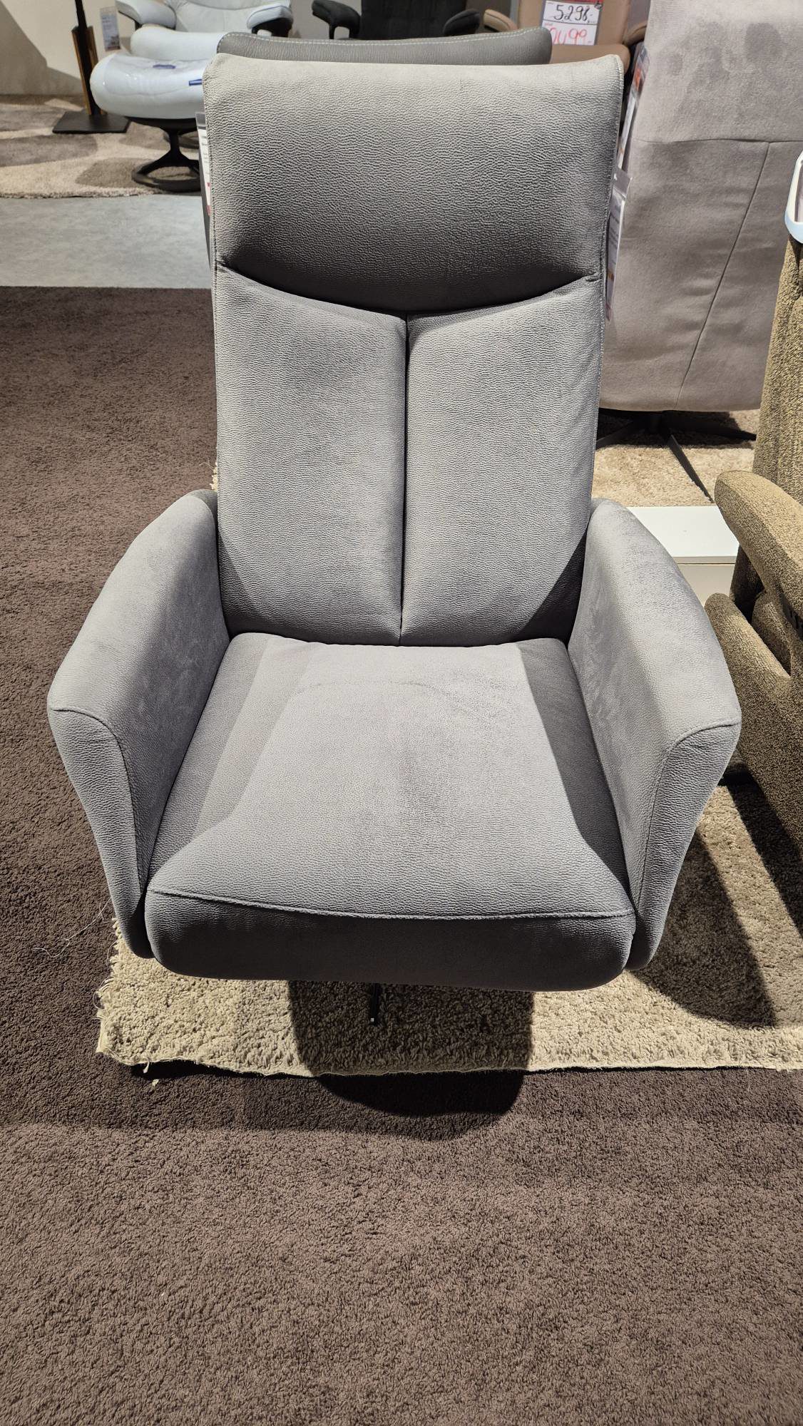 Der Relaxsessel 8026 der Firma Knudsen ist im grauen Stoff bezogen. Er lässt sich ganz einfach durch eine motorische Verstellung in eine bequeme Liegeposition bewegen.