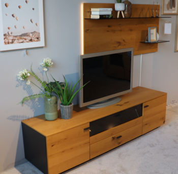 Lack seidenmatt anthrazit, Balken eiche Honig, Griff anthrazit matt