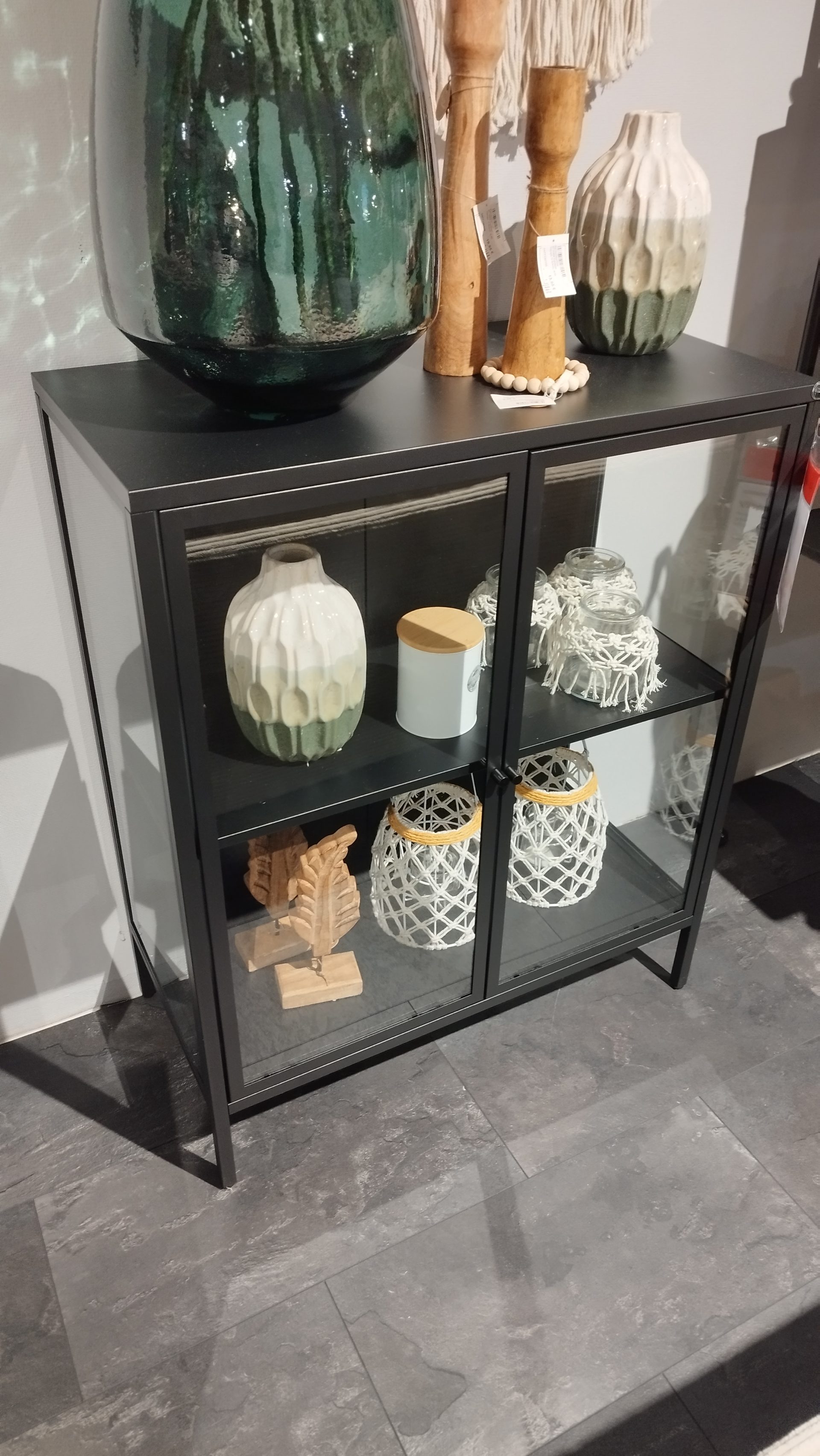 Metall schwarz matt rau pulverbeschichtet, BxHxT: 80x99x40cm mit 2 Glastüren und 1 Regalboden