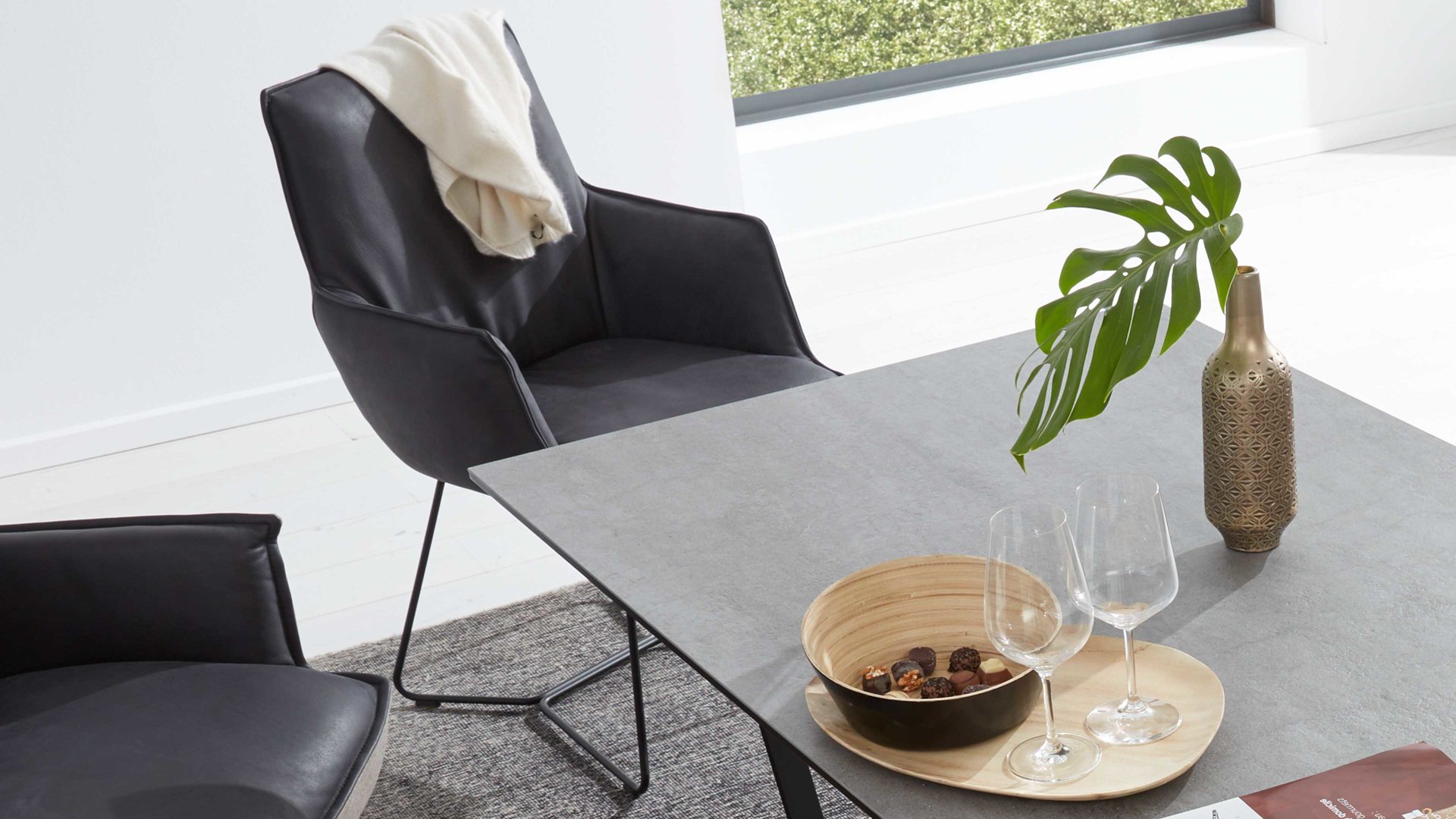 • Die Abbildung zeigt ein Wohnbeispiel, welches auch Dekoration sowie separat erhältliches Zubehör enthält. Im Lieferumfang enthalten ist der Dreh-Armlehnstuhl Genzo.